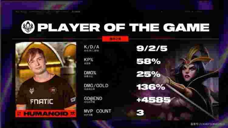 FNC打出了24-7的击杀比击溃TES,其中FNC中单Humanoid选手使用妖姬拿到了MVP