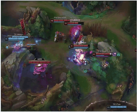 第11分钟,双方围绕虚空巢虫爆发团战,奎桑提绕后缠住FNC后排,TES趁机处理FNC前排,卢锡安输出爆炸,TES成功打出一波1换2并抢下一条虚空巢虫。