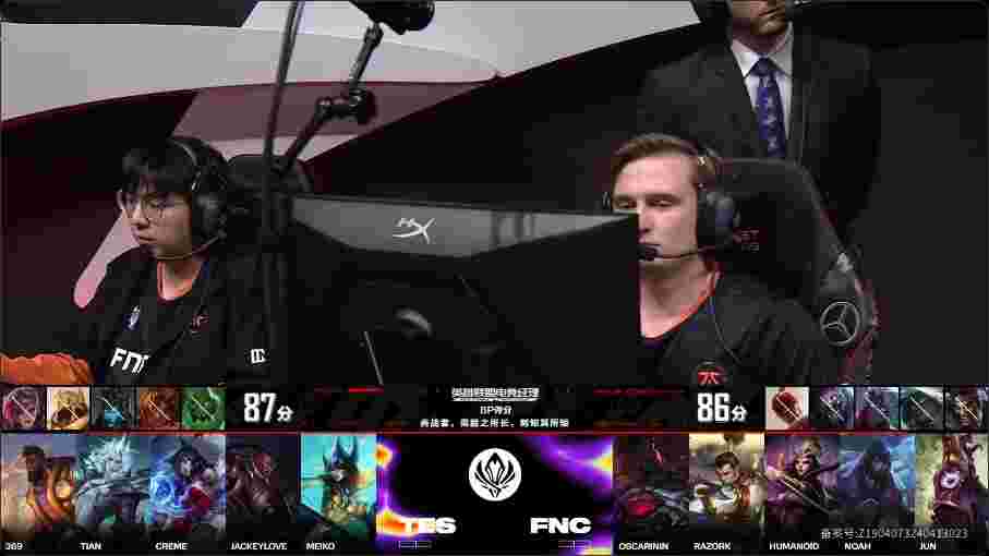 第18分钟,FNC四人集合成功越塔击杀下路带线的鳄鱼,但后续TES众人及时赶到完成包夹,双方爆发全面团战,TES打出精彩拉扯成功打成3换4,经济优势来到6k。