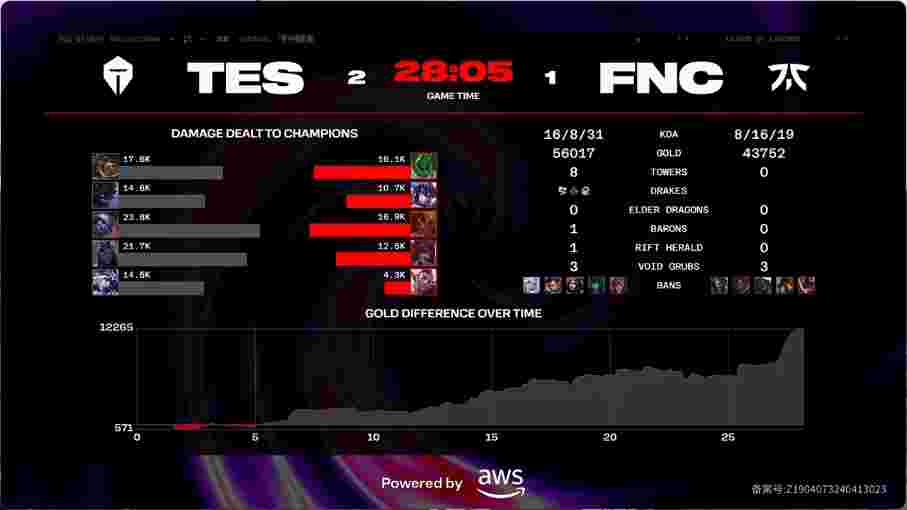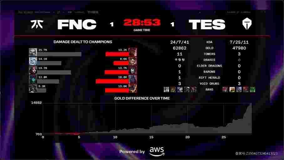 第23分半,FNC蓝区开团,赵信与赛恩进人群扛不住伤害分别被带走,TES打出0换2收掉大龙,经济领先8k。