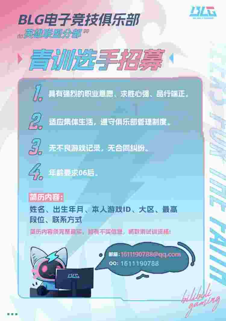 5月4日,BLG电子竞技俱乐部官博更新,发布英雄联盟分部青训选手招募海报,并配文:符合条件者请准备好个人简历并按图中邮箱地址联系我们的工作人员。BLG英雄联盟分部期待你的加入! !