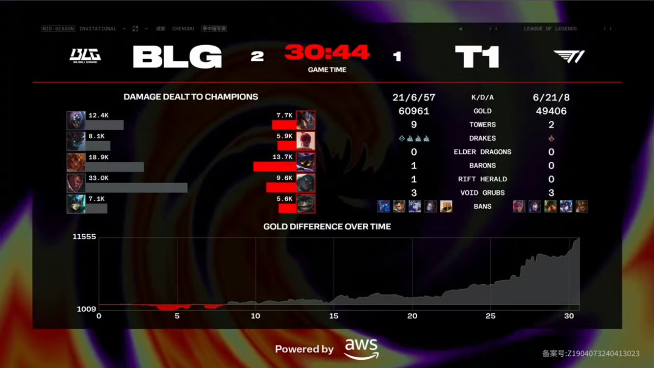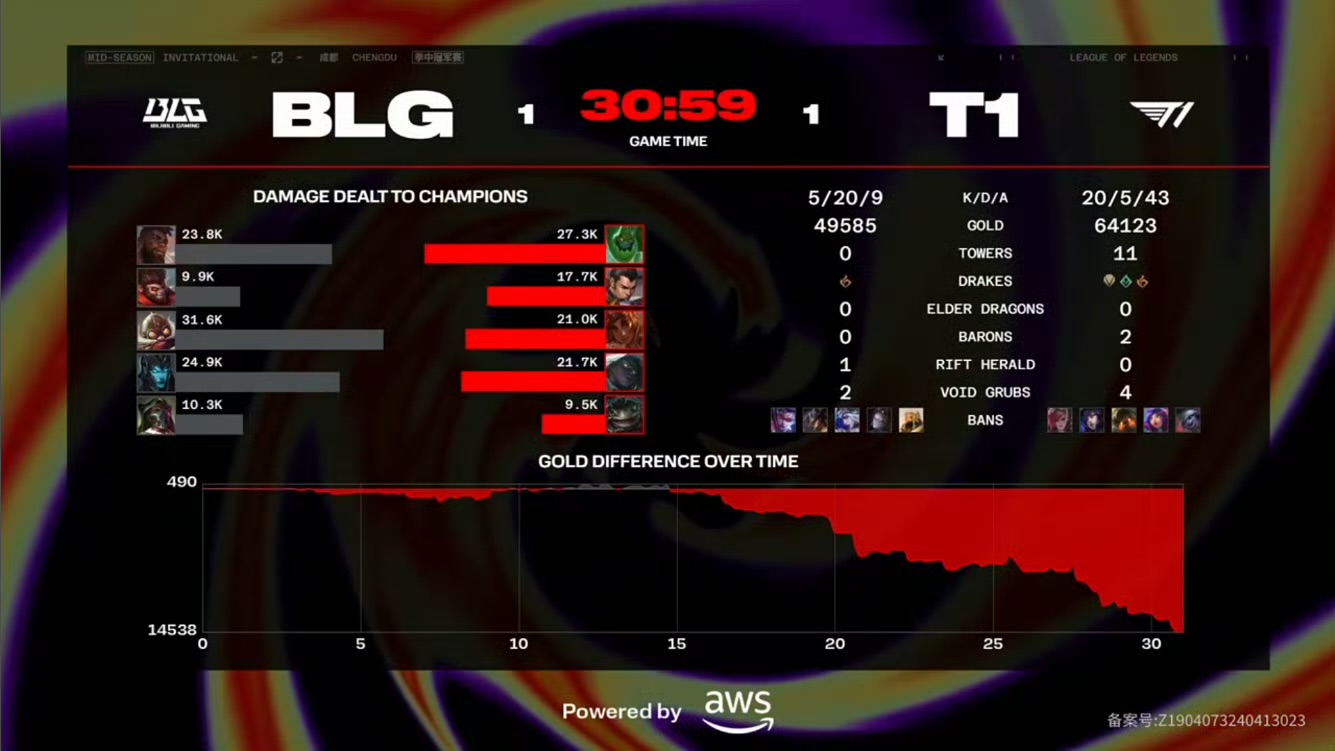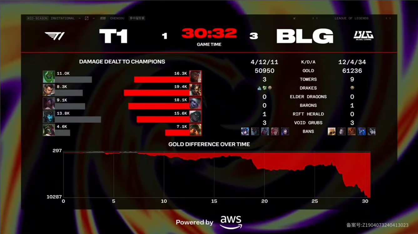 【30:10】BLG拿下风龙后中路团灭T1,势如破竹拿下第三局比赛。