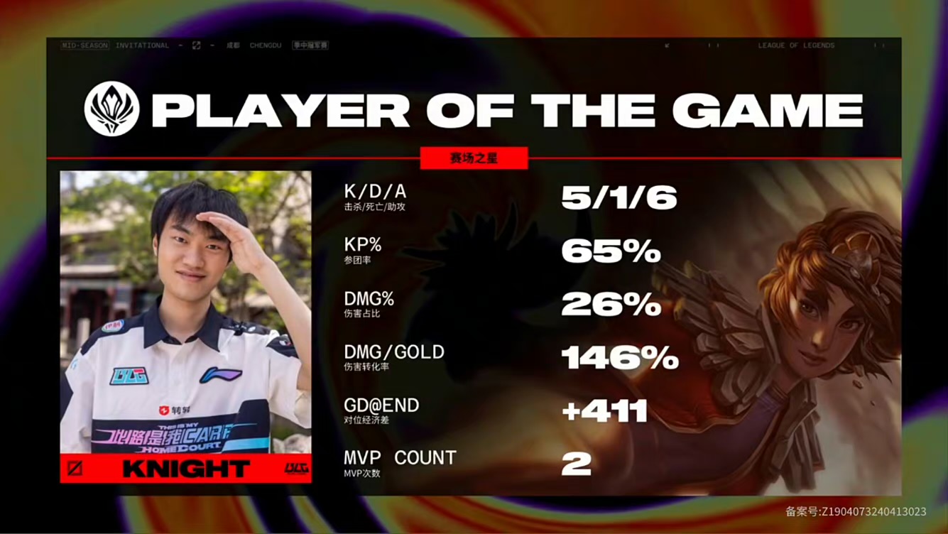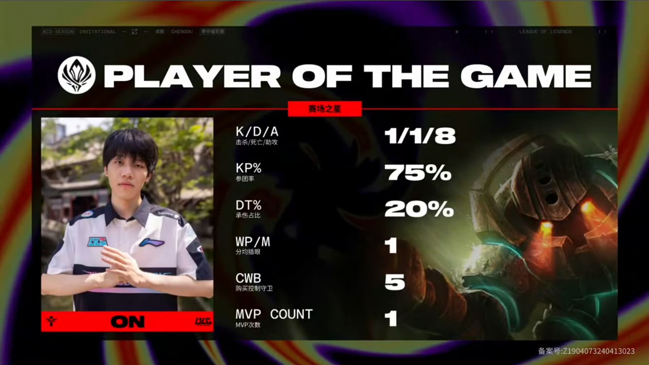 【19:35】BLG拿下小龙后,武器TP上路开启大招想击杀卡牌,盲僧赶到R闪踢回武器,但武器闪现W跳回队友身边。