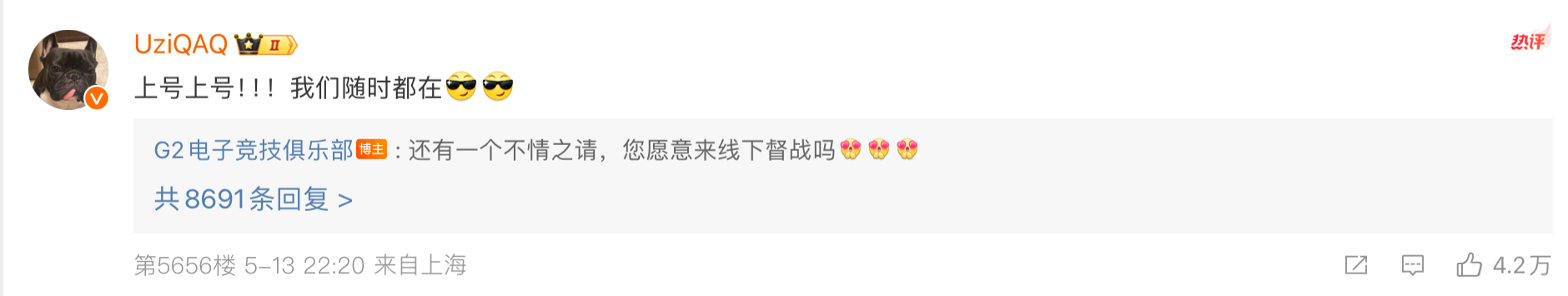 Uzi也在这条微博下评论:上号上号!!!我们随时都在。
