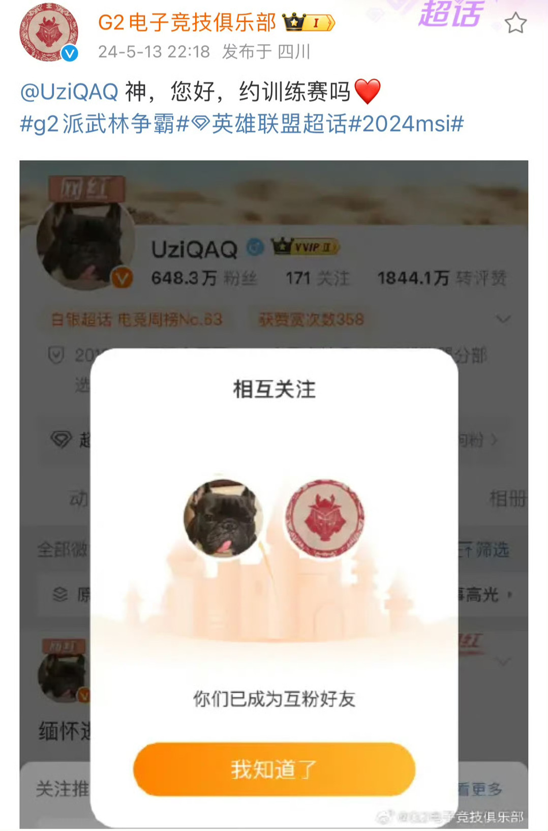 北京时间5月13日晚,G2官博发文向Uzi发出邀请:神,您好,约训练赛吗?