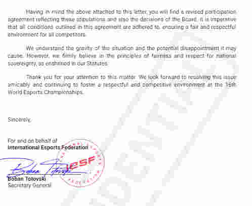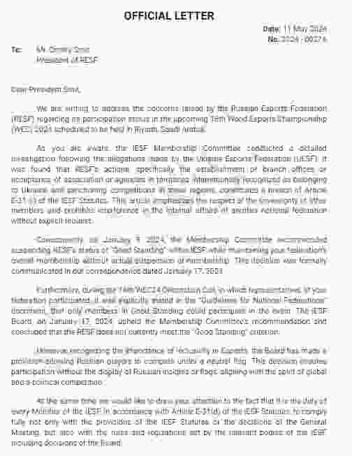 8月28日的IESF 世界锦标赛决赛期间,IESF的110个成员进行了会谈,会议进行了44项提案议程。俄罗斯代表提出希望明年俄选手可以以本国国籍和国旗参赛。