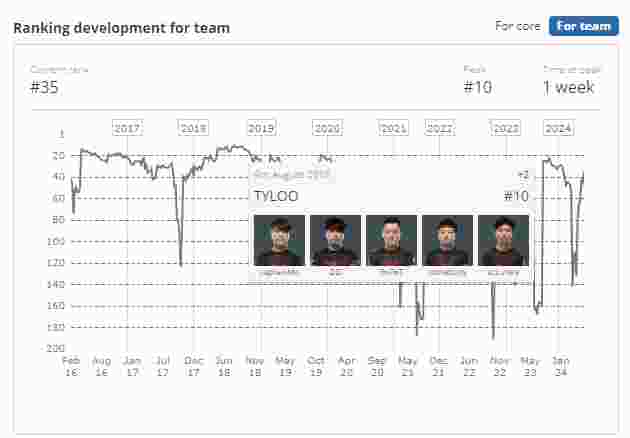 2018年8月,TYLOO因在FACEIT 伦敦Major中出色的表现,世界排名来到队史最高的第十名。当时TYLOO战队阵容为:captainMo、DD、BnTeT、somebody和xccurate。
