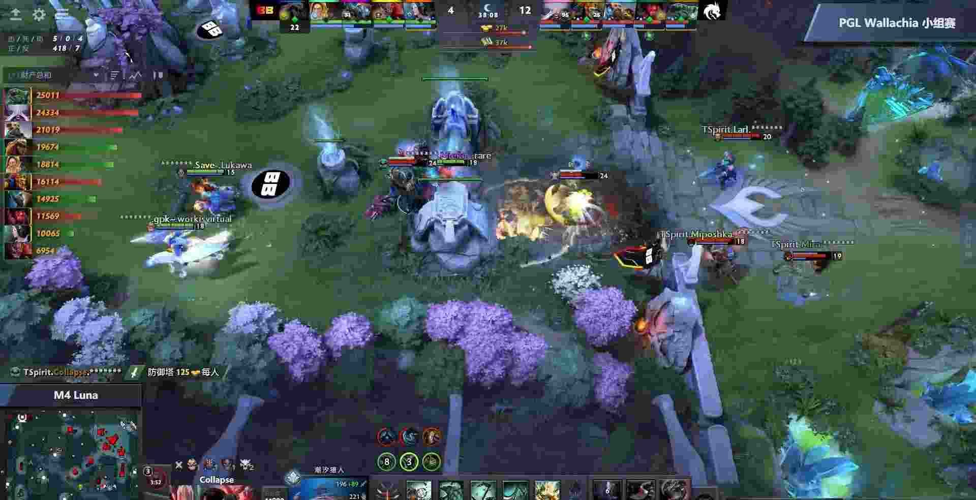 38分钟TS带盾推高,磨掉高地塔后小小先手投掷丢回小狗,TS只得强行四塔开团,好在爆发足够让谜团没能拉大就和小小一同被击杀。