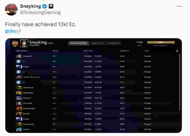 Falcons战队的五号位选手Sneyking近日在其个人推特上宣布了一个令人瞩目的成就:他的天梯分数成功突破了13000大关!在他的推文中,他简洁地写道:“终于达到了13000分!Ez。”这一消息在战队和粉丝中引起了一阵热议和祝贺。