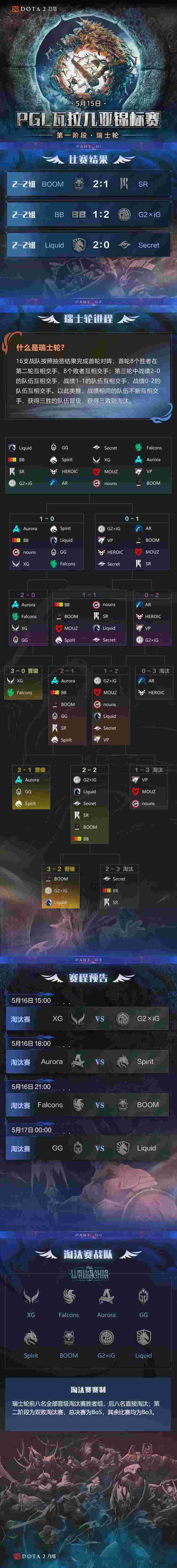 最终3-0的Falcons、XG,3-1的Aurora、GG、Spirit,以及3-2的BOOM、G2×iG、Liquid晋级淘汰赛;0-3的HEROIC、AR,1-3的VP、nouns、MOUZ,以及2-3的SR、BB以及Secret从瑞士轮中淘汰。
