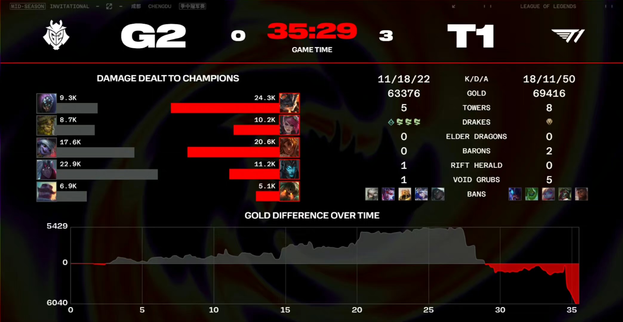 【22:00】炼金龙刷新,德莱文抢到大龙,G2打算继续追击时被卡密尔绕后进场大招定住德莱文,德莱文被秒杀,G2团战溃败,T1打大龙,螳螂跳进龙坑但没能成功