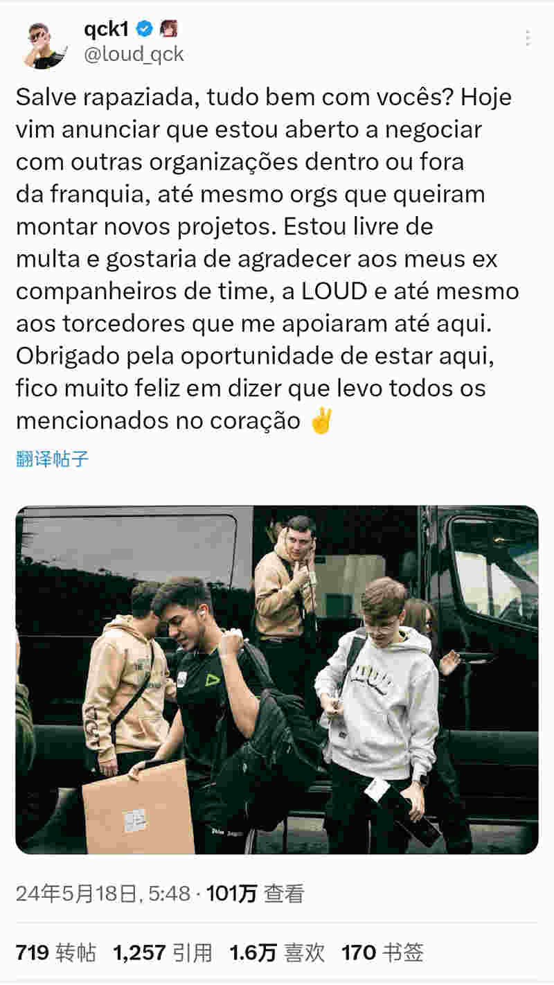 qck在推特上确认了自己已经离开LOUD,推特原文翻译:“我已经开始找新东家了,不管是顶级联赛的队伍还是次级联赛的队伍都在我的考虑范围之内,甚至是新组建的队伍我也会考虑。我从LOUD离队之后没有背负违约金,然后我想感谢我的前队友、还有前东家LOUD战队,还有一直支持我的粉丝们。感谢你们对我的认可,我非常高兴,我会记得所有关心我的人。”