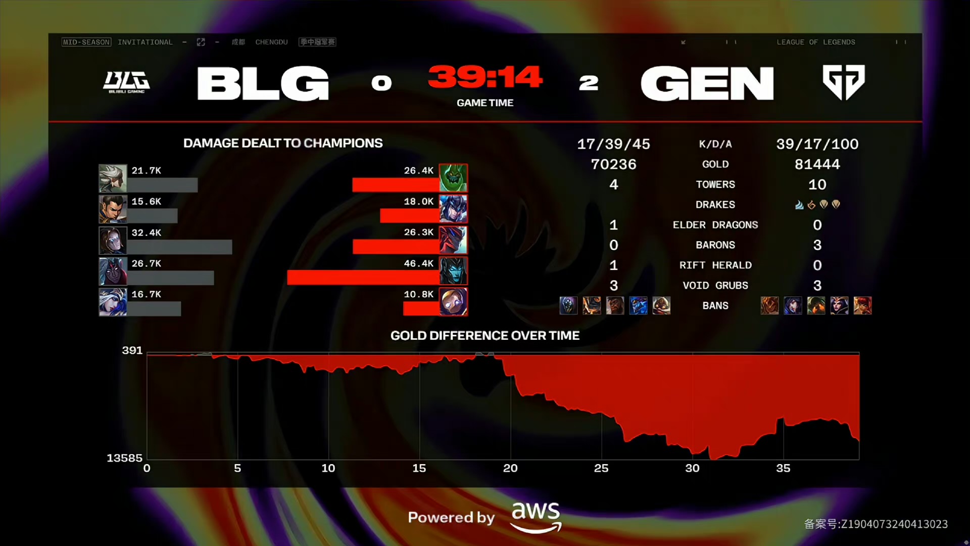 【39:00】双方中路拉扯,塔姆先被集火击杀,但豹女精准伤害计算击杀兰博,武器进场晕住两人,BLG团灭GEN,一波结束比赛,扳回一城。