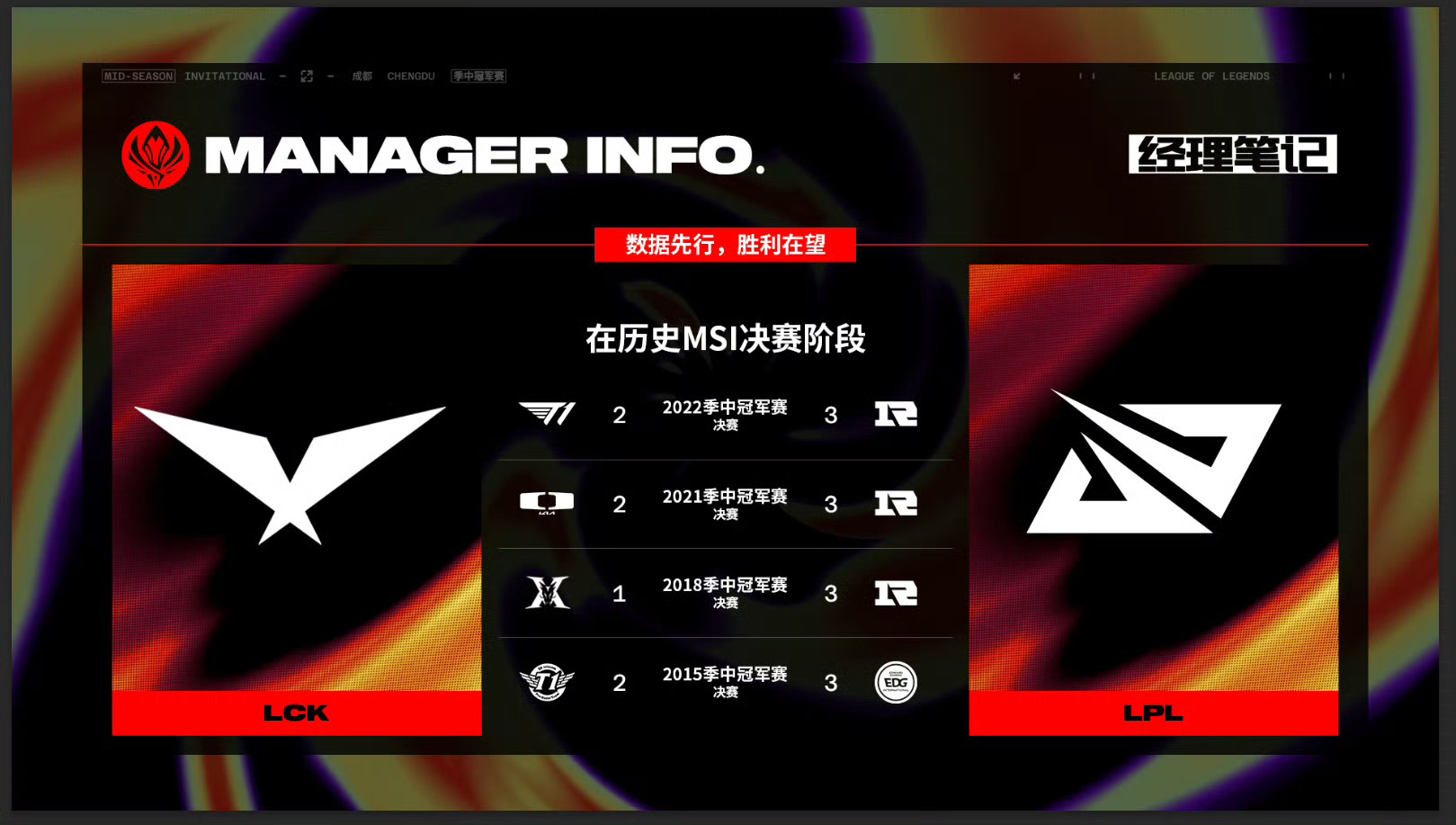 在历史MSI决赛阶段,LPL与LCK赛区战队交手记录
