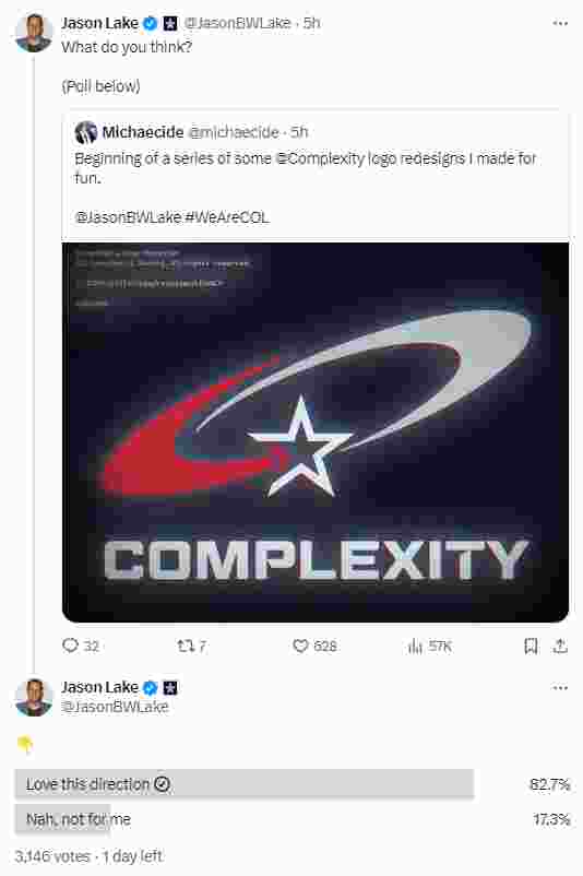 Complexity设计全新logo样式,此举引来Jason Lake(Complexity俱乐部CEO)围观,并发起针对该“新老融合”版本LOGO喜好程度的投票。目前,在3000多名投票者中,已有超过八成投票者表示喜欢这一设计。