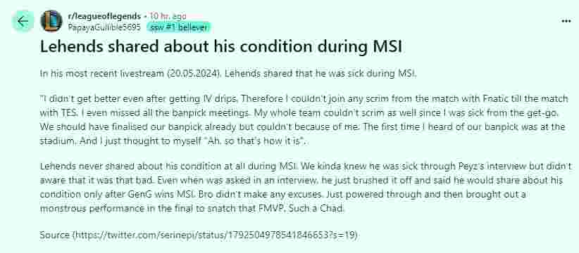在MSI期间,Lehends从未透露过自己的病情。观众只能通过Peyz的采访知道他生病了,但并不清楚情况有多严重。即使在采访中被问及,他也只是随意带过,并表示只有在Gen.G赢得MSI后才会分享自己的状况。他没有找任何借口,坚持到底,在决赛中展现出惊人的表现,赢得了FMVP,了不起的选手。