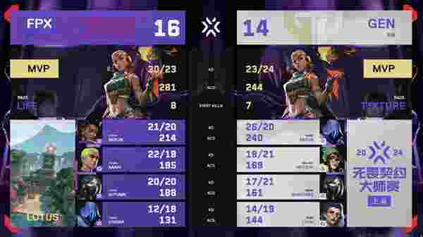 FPX虽然在上半场取得了大量的分数领先,但是他们在防守方并没能很好地发挥出阵容的优势,导致他们在下半场在拿下赛点的情况下被GENG成功翻盘将比赛拖入了加时。来到加时赛的双方拼尽了全力,连续鏖战3个加时最终还是FPX顶住了压力,恭喜FPX 16-14 GENG!