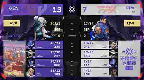 图二来到日落之城,拿下手枪局胜利的GENG稳健发挥,他们在之后的anti-eco中也没有出现失误。FPX在上半场打的非常艰难,多个小分都是依靠选手的个人能力完成险胜,GENG在上半场的进攻方也出现过不少的失误,因此上半场结束,双方比分来到6-6。