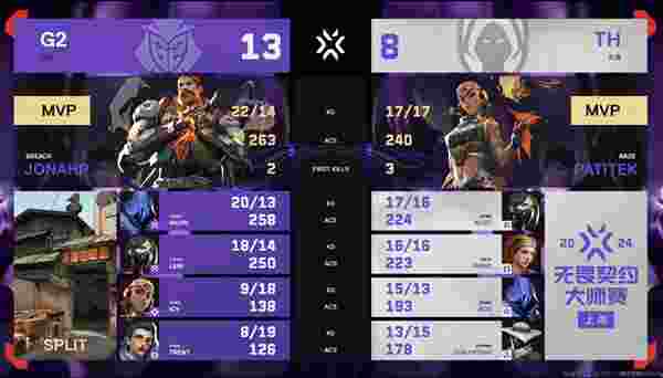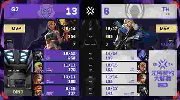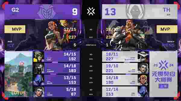 下半场手枪局TH进攻B区,leaf二楼回防一换二,trent不负众望完成残局,G2拿到11分。比赛来到第十五局枪械劣势的G2主动出击被TH逐个击破,TH推进A区成功阻止G2拿到赛点。经济局的G2人海战术从B2楼回防,icy双杀打破僵局,JonahP精准正义拿下残局,G2拿到赛点。赛点局TH快攻中路夹击B区,benjyfishy渗透到二楼完成三杀扳回一个赛点。但巨大的分差并未给TH更多的容错,调整后的G2稳稳拿下比赛。