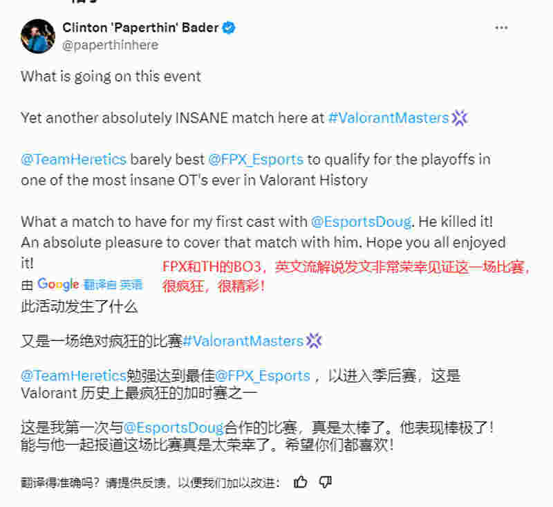 昨天FPX与TH的比赛,在决胜图打出了惊世骇俗的加时鏖战,而当时的官方英文流解说赛后也发推表达了自己激动的心情:TH艰难战胜FPX晋级八强,但我要说我见证了本次上海大师赛最疯狂的加时赛,比赛太精彩了,非常荣幸能解说到这场比赛!