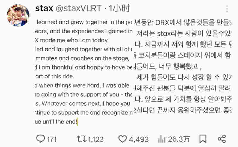 昨天DRX官宣将stax下放至板凳席,对此stax在发推进行了回应:在过去的四年时间里,我和我的队友们一起学习和成长,DRX的这段经历塑造了今天的我,我和我的队友们和教练一起在舞台上哭过、笑过,非常感激这段旅程有你们的存在。当我遇到困难的时候,我还有粉丝们的支持,也因此我才有动力继续前进,无论以后发生什么,希望你们还可以继续支持我、认可我,陪我一直走下去!