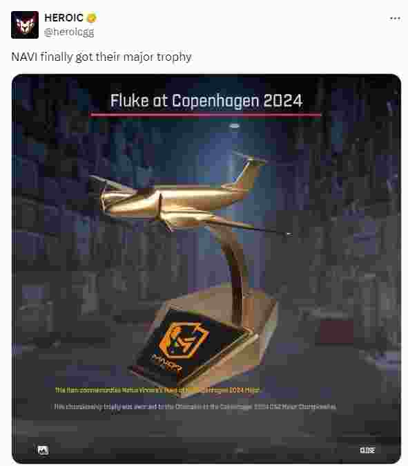 HEROIC官推再次整活,发布了一张飞机形状的CS游戏奖杯,并配文: