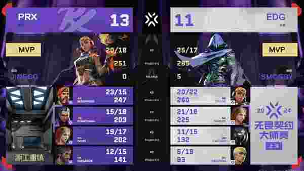 渐入佳境的EDG防守十分主动,前压拉满信息包点交叉火力拦截进攻,上半场拿到6分。攻防转换后EDG来找B区麻烦,Jinggg一把狂射四杀拯救队伍拿下手枪局。比赛来到第十五局EDG干净利落进攻A区,nobody且战且退的神级走位拿下1v1残局。长枪局EDG来找B区麻烦,something戍卫穿点四杀打崩对手经济。但幸运女神不会总眷顾PRX,重整旗鼓的EDG进攻如鱼得水扳平比分。然而PRX两波非常规赌点防守拿到赛点。赛点局枪械劣势的EDG浴室发起进攻,完美拉枪线扳回一个赛点。最终局PRX三人前压A小击溃EDG取得胜利。
