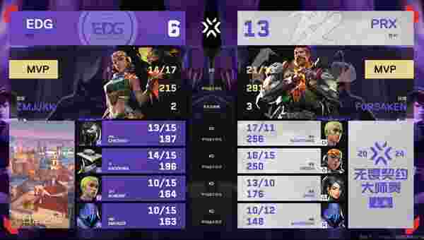 全场比赛的总比分:EDG 0-2 PRX 源工重镇(11-13)日落之城(6-13)
