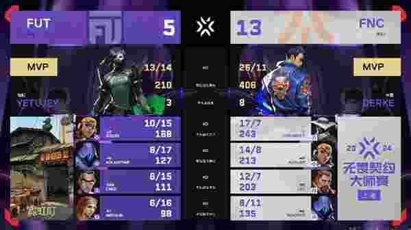 比赛来到第15回合,开局FNC选择常规默认,主攻方向放在了中路和A大,而B区由于没有进行默认,很快就被yetujey摸到了近点。Derke在A大第二时间开大进点探查信息,看到点内两人的情况下马上call队友进行转点,而同时FUT因为夜露的大招而不得不把中路的队友call回A区进行防守,B区包点中仅有cend一人在看防。FNC中路转B的速度极快,他们很快就拿下了包点的控制权,yetujey没能偷掉更多人,轻松拿下包点的FNC很快就将FUT回防的众人一一击毙。