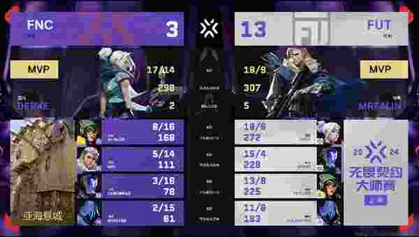 FNC在图二的下半程颓势尽显,FUT在防守方的出色发挥让FNC没能在下半场展开追分。率先拿下赛点的FUT趁胜追击,迅速以13-8收下了最后的胜利。