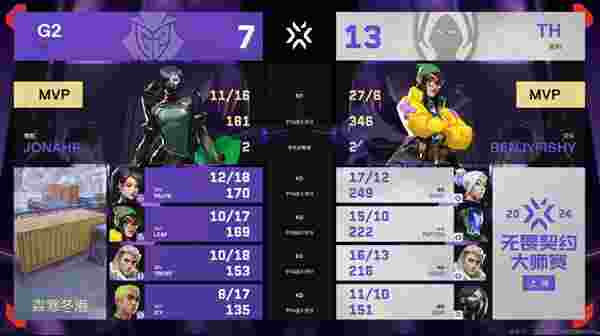 攻防转换后TH第一波攻打A区后光速转B,完美的战术执行轻松拿下手枪局。G2不想放出赛点强起三把蜂刺,valyn三杀带领队伍走向胜利。来到长枪局TH慢攻B区,RieNs依靠队友拉枪线瞬间四杀改变局势,TH拿到赛点。赛点局Wo0t带领队伍进攻B区拿到首杀,valyn神级走位一换二,队友强拆爆能器追回一分。但巨大的分差并未给G2更多机会,重整旗鼓的TH最终13-7拿下选图。