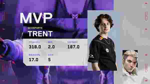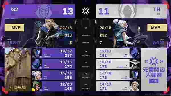 下半场手枪局TH在A小展开攻势,Boo与paTiTek完成劣势残局拿到11分。G2不想放赛点强起重防B区,G2主动出击五人清中路拿到人数优势翻盘成功。拥有分数优势的TH选择eco再放一分。长枪局icy端出冥驹架死中路拿到首杀,G2在B布下天罗地网打崩对手经济。第十八局TH在中路做好默认后转攻A小,JonahP惊人瞄准四杀挽回劣势,比分差距逐渐缩小。经济溢出的G2端出奥丁,trent拿到趁手武器如鱼得水,B区防守固若金汤反超比分先拿赛点。最终局TH再次进攻B区,trent奥丁再击杀两人最终13-11扳回一城。