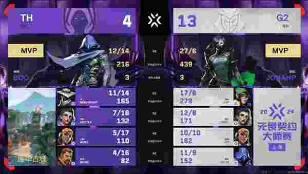 下半场手枪局G2慢出A大人海战术一换一,G2趁势占下A包点,JonahP双杀决定比赛走势。第十五局TH主动出击前压B区二换一,JonahP解决走单的保安,队友攻下C区将对手送入经济局。次局枪械劣势的TH没有了反扑的希望被对手拿到赛点。赛点局leaf单吃wo0t,G2依靠黑梦大招进攻A点结束比赛。