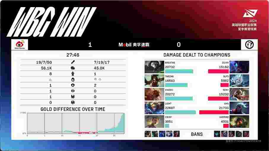 第26分钟,双方在中路爆发团战,卡密尔侧面无敌进场先秒派克再杀豹女最终W闪Q打残沙弥拉,WBG正面跟上技能,WBG轻松打出一波1换4顺势拿下大龙,经济领先来到近7k。