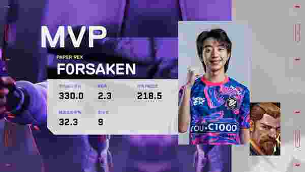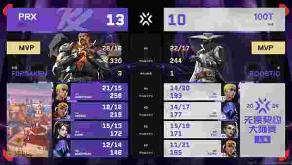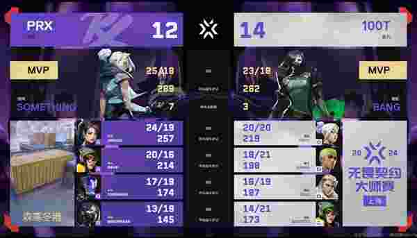 第十五局100T再次组织进攻B区,f0rsakeN左右开弓完成1v2残局帮助PRX拿到守方第一分。次局100T再来找B区麻烦,eeiu再次关键双杀决定比赛走势,比分扳平。双方回到同一起跑线后100T突施冷箭rushB,攻占包点后散开站位反超比分。PRX意识到包点防守不奏效主动前压A区大获全胜。次局something前压B区配合道具三杀,重新找回状态的Jinggg四杀助PRX拿到赛点。赛点局枪械劣势的100T失去了翻盘希望,PRX扳回一城。
