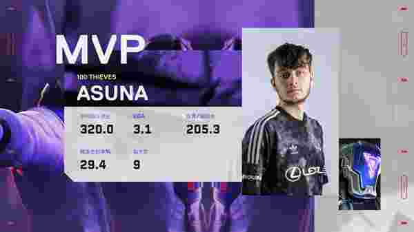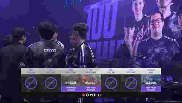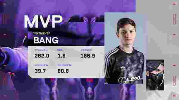 下半场手枪局100T进攻A区,d4v41正义双杀减缓节奏,队友迅速补防取得胜利。第十五局bang配合队友寻敌箭穿点三杀瓦解B区防线,100T拿到第八分。在B区尝到甜头的100T佯攻B区吸引火力后20s转攻A区,打崩对手经济。暂停调整后的PRX重防B区,100T却出其不意rushA,部署爆能器后形成交叉站位拦截回防的对手再拿一分。PRX被动防守不奏效开始前压B区,Jinggg三杀稳住军心吹起反攻号角。双方再次来到同一起跑线后100T快攻A区,Asuna三杀突破,bang双杀结束残局拿到赛点。最终局f0rsakeN救主三杀将比赛拖入加时。加时赛100T重整旗鼓14-12淘汰PRX晋级下一轮。