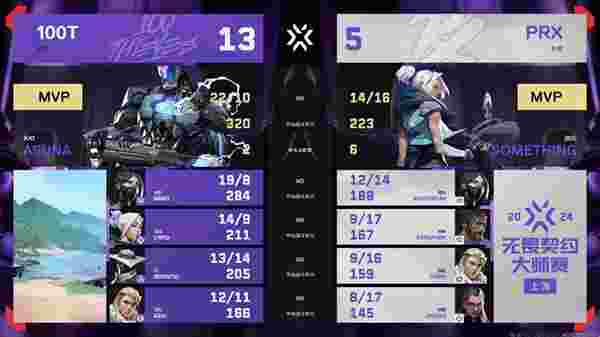 全场比赛的总比分:PRX 1-2 100T 微风岛屿 (5-13)日落之城(13-10)森寒冬港(12-14)