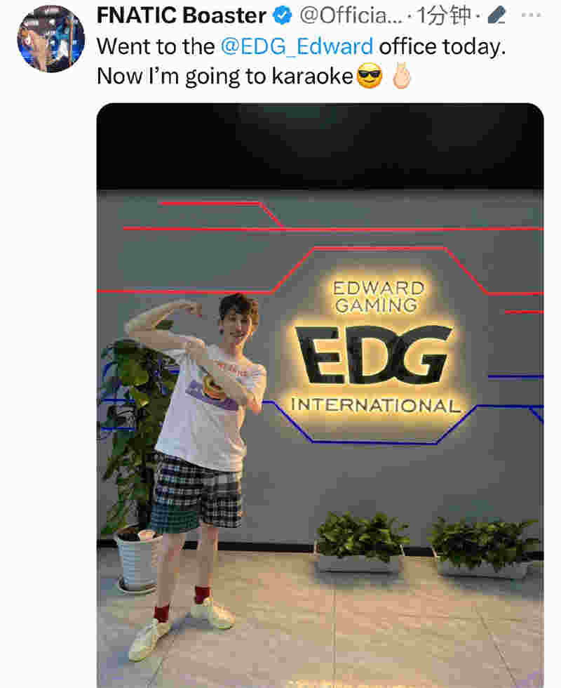 今天,FNC的大B老师做客EDG俱乐部,发推表示自己要在EDG的基地唱卡拉OK。看起来大B老师已经从失败的阴影里,迅猛地走了出来。