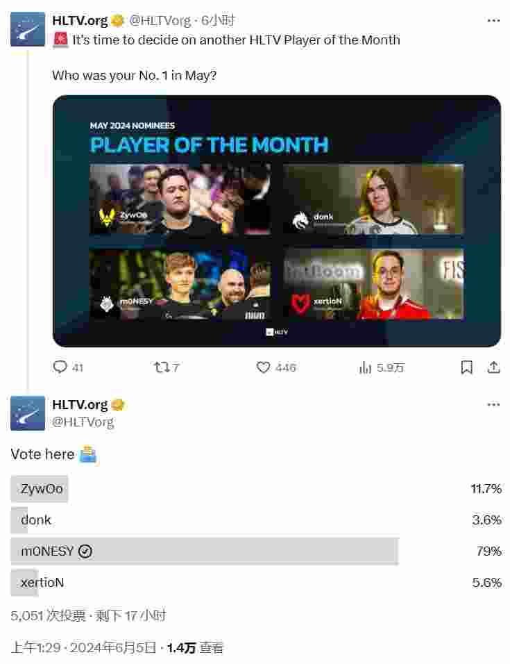 今天HLTV发起了五月最佳选手的投票,其中一共有四位候选人,分别是ZywOo、donk、m0NESY和xertioN这四位顶级明星选手。