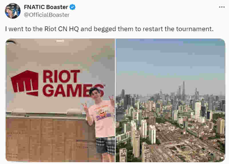 我们熟悉的大B老师又开始整活了,昨天Boaster选手晒出了到访上海拳头总部的照片并配文:我来到了中国拳头总部,并且恳求他们重新开始打上海大师赛。怎么,要打复活赛是吧?