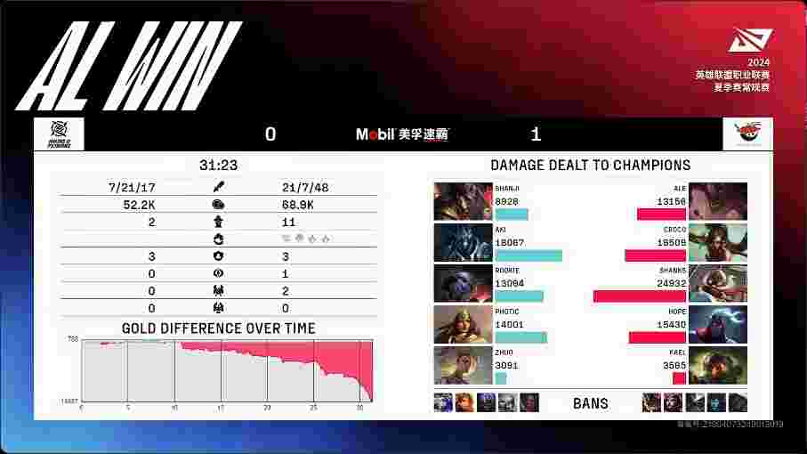 第16分钟,小炮上路贴脸想强杀飞机被赶来的豹女救下,随后死歌想开大收割被泰坦一个闪现钩打断。AL中野追到上二塔强杀小炮,卡牌大招绕后姗姗来迟,结果落地被赶到的AL四人合力留住送掉。