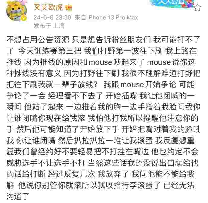 6月8日深夜,FPX上单选手Xiaolaohu在个人微博突然发文称自己因为和助理教练Mouse产生争执,被经理要求滚蛋,“不打了回家了,不想被威胁”,之后Xiaolaohu继续发文解释了前因后果,起因是和Mouse因为兵线问题产生了争论,但是FPX的经理再次涉入其中插嘴被Xiaolaohu直言“闭嘴”,直接惹恼了经理,经理直接扬言让Xiaolaohu滚蛋,且处于盛怒状态完全无法沟通