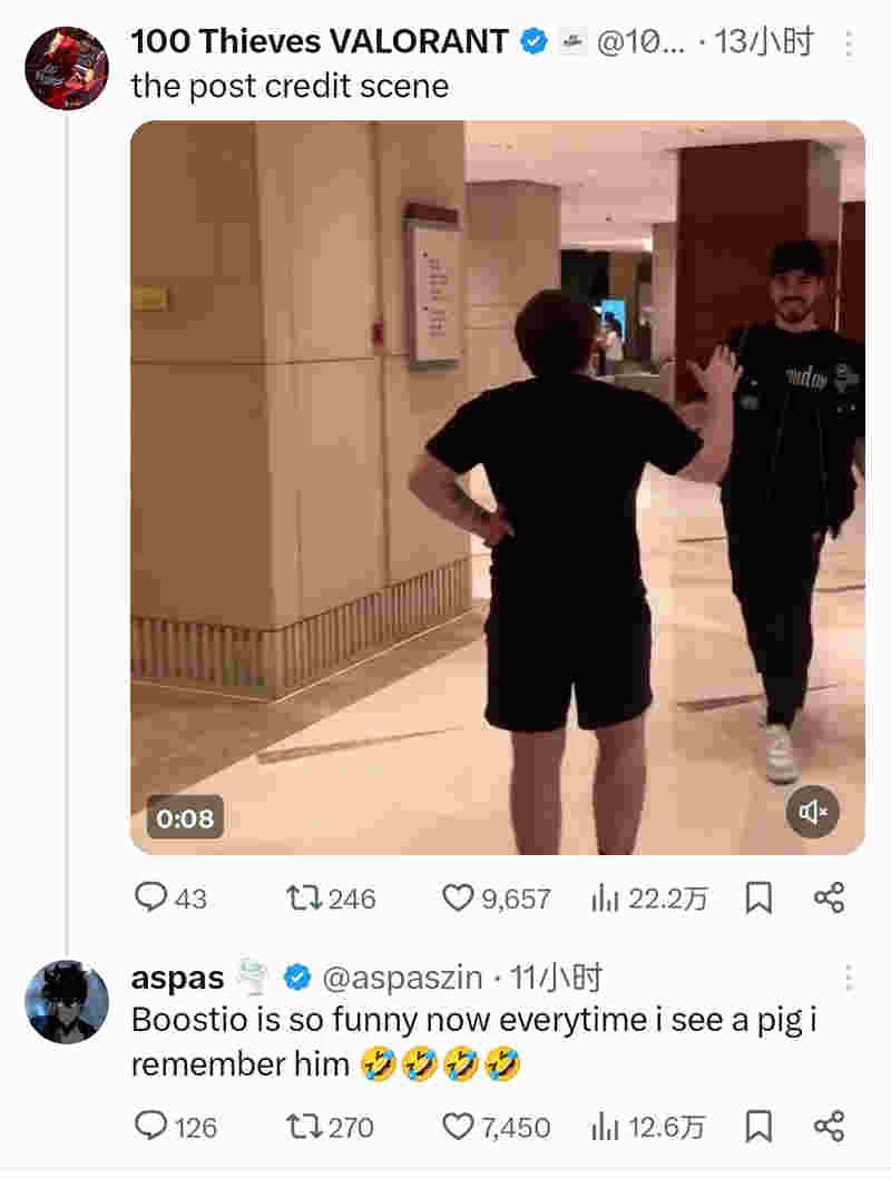 上海大师赛期间,Aspas与Boostio在酒店相遇后,牢帕还“夸”了一波小B老师:“现在每次我看到一只猪,都会想起Boostio,他太有趣了”