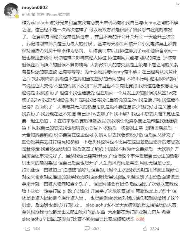 6月9日,原FPX打野选手Moyan在个人社媒发文力挺Xiaolaohu,爆料FPX经理Denny曾威胁其降薪: