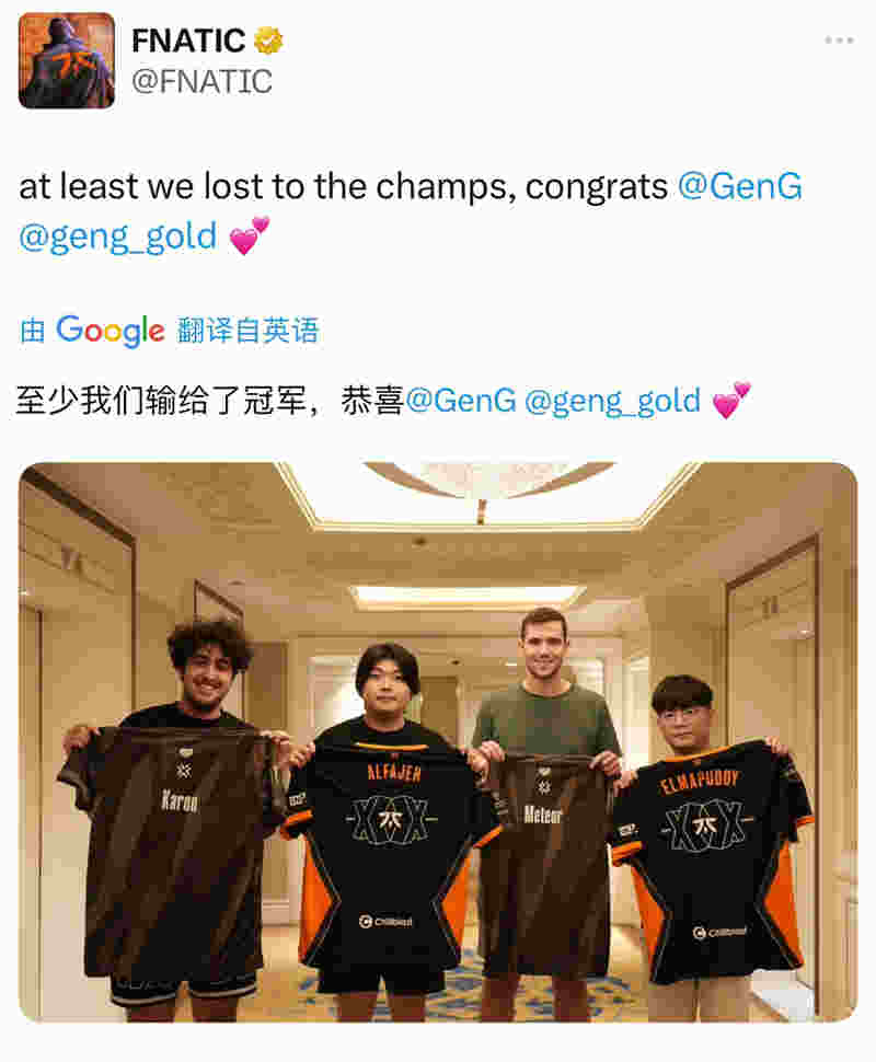 Fnatic:至少我们输给了冠军,恭喜GEN获得冠军!