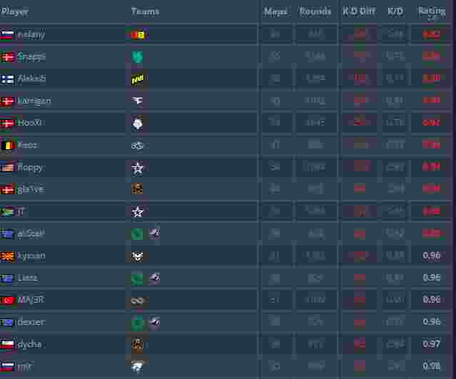 Vladislav Gorshkov | nafany是所有职业选手中在2024年上半年线下赛表现最差的选手。在40张地图中这名俄罗斯指挥仅打出0.82 rating。在845个回合中,他的K-D差为-208,这一数据仅次于FaZe的指挥karrigan和G2指挥HooXi。