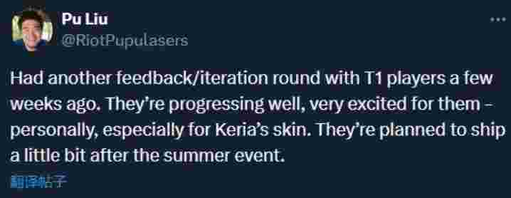 此外Pupulasers在回复网友提问时也谈到了T1冠军皮肤的进度,他表示几周前听取了T1选手的新一轮反馈后进展很顺利,尤其对他个人而言他最期待Keria的皮肤。预计T1冠军皮肤会在夏季大事件结束后不久出。