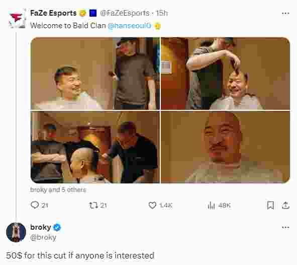 FaZe选手给他们的体育总监Eddie剔了光头。FaZe俱乐部官方也是发布了动态:“欢迎加入光头一族。”