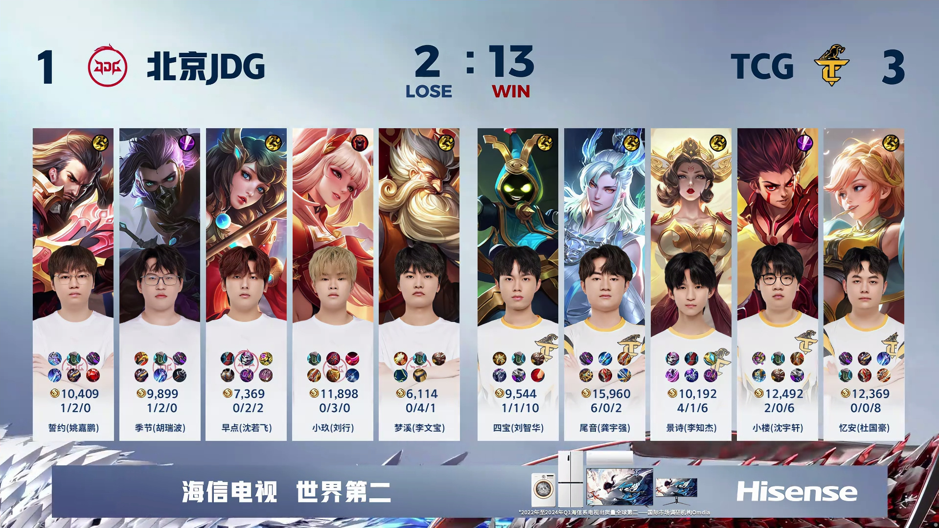 十分半TCG收下暗影暴君,北京JDG开始被动防守,十二分钟北京JDG多人连续掉点,TCG趁机再控一条暗影主宰,双方经济差来到9K。十六分钟北京JDG三高全破只剩水晶,TCG一鼓作气将北京JDG逐个击破几乎团灭,直接点破水晶,拿到本场比赛的胜利!