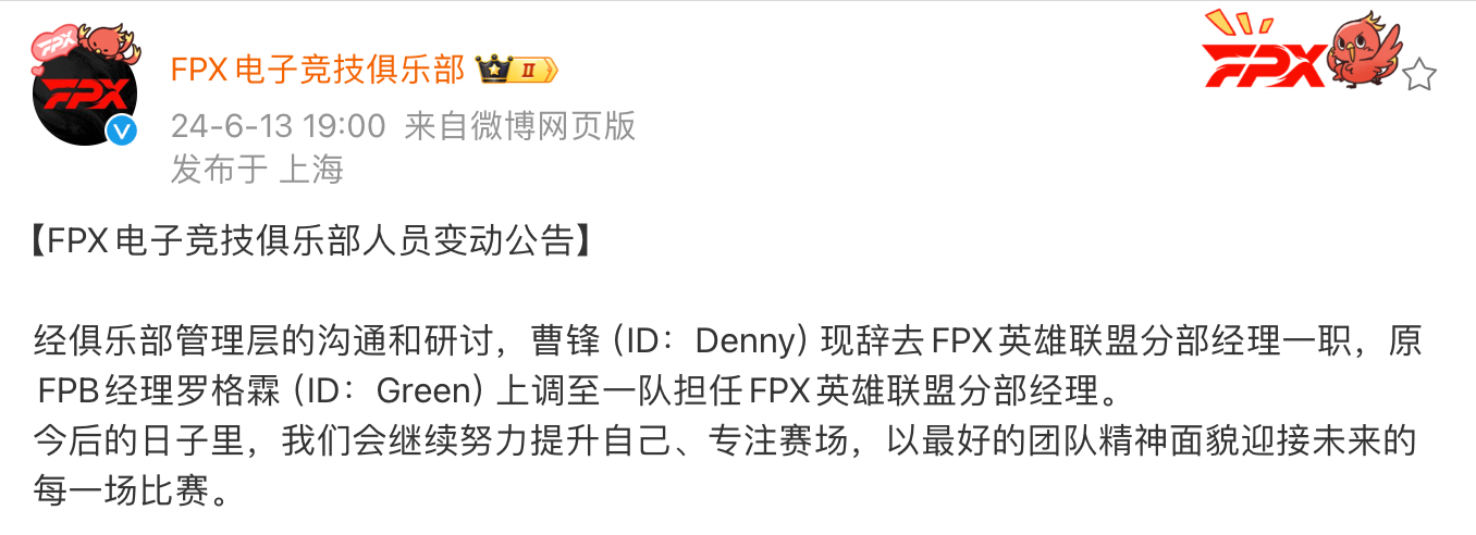 经俱乐部管理层的沟通和研讨,曹锋(ID:Denny)现辞去FPX英雄联盟分部经理一职,原FPB经理罗格霖(ID:Green)上调至一队担任FPX英雄联盟分部经理。